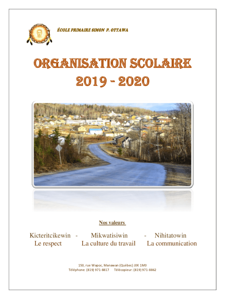 Organization Claire 2019 2020Nos valeursKicteritcikewin Mikwatisiwin Le respect La culture Du travailNihitatowin La communication150, rue WaPo, Canaan (Quebec) J0K 1M0 Tl phone: (819) 9718817 Copier: