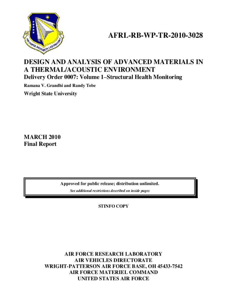 AFRLRBWPTR20103028DESIGN AND ANALYSIS OF ADVANCED MATERIALS IN A THERMAL/ACOUSTIC ENVIRONMENT Delivery Order 0007: Volume 1Structural Health Monitoring Ramona V. Gandhi and Randy TobeWright State