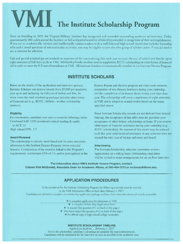 The Institute Scholarship Program Since its founding in 1839, the Virginia Military Institute has recognized and rewarded outstanding academic achievement. Today, approximately 100 cadets attend the
