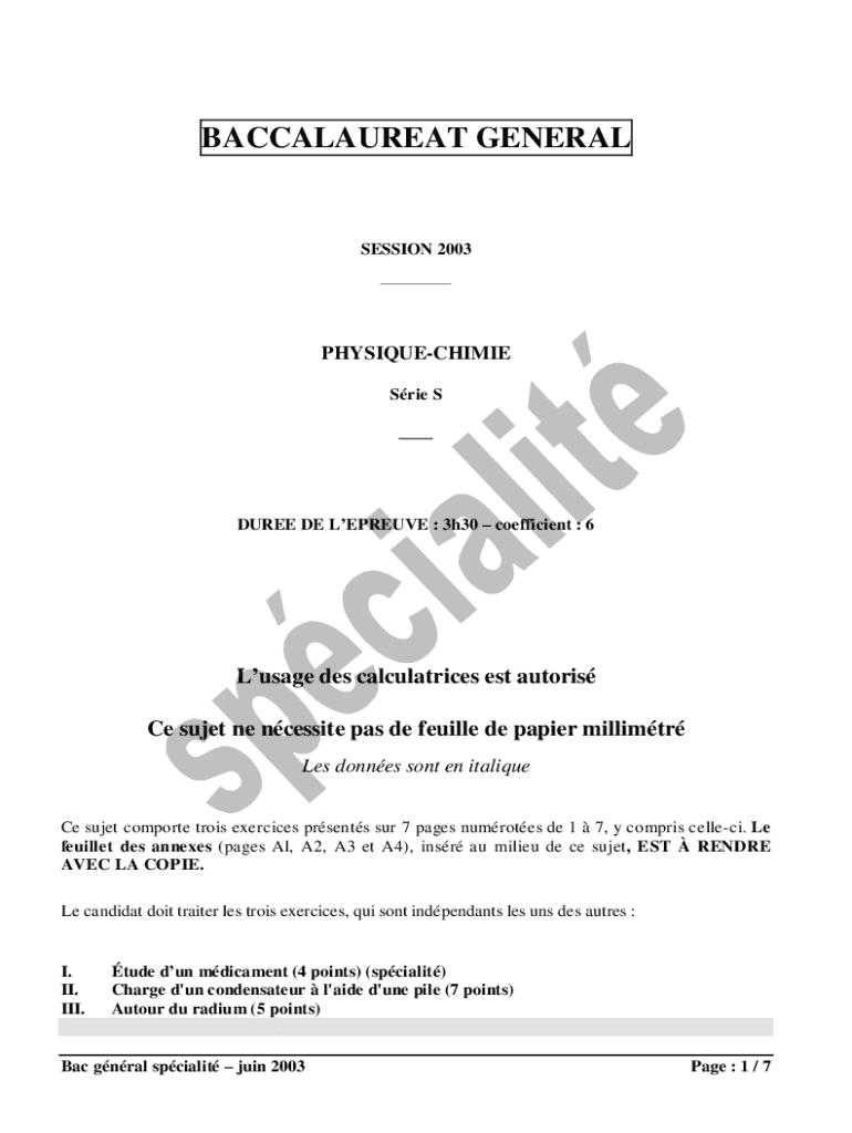 BACCALAUREATE GENERALSESSION 2003 ___PHYSIQUECHIMIE Erie S ___Purée DE DEPRIVE : 3h30 coefficient : 6Lusage DES calculations est actors Ce suet né necessity pas de Seville de paper millimeter Les