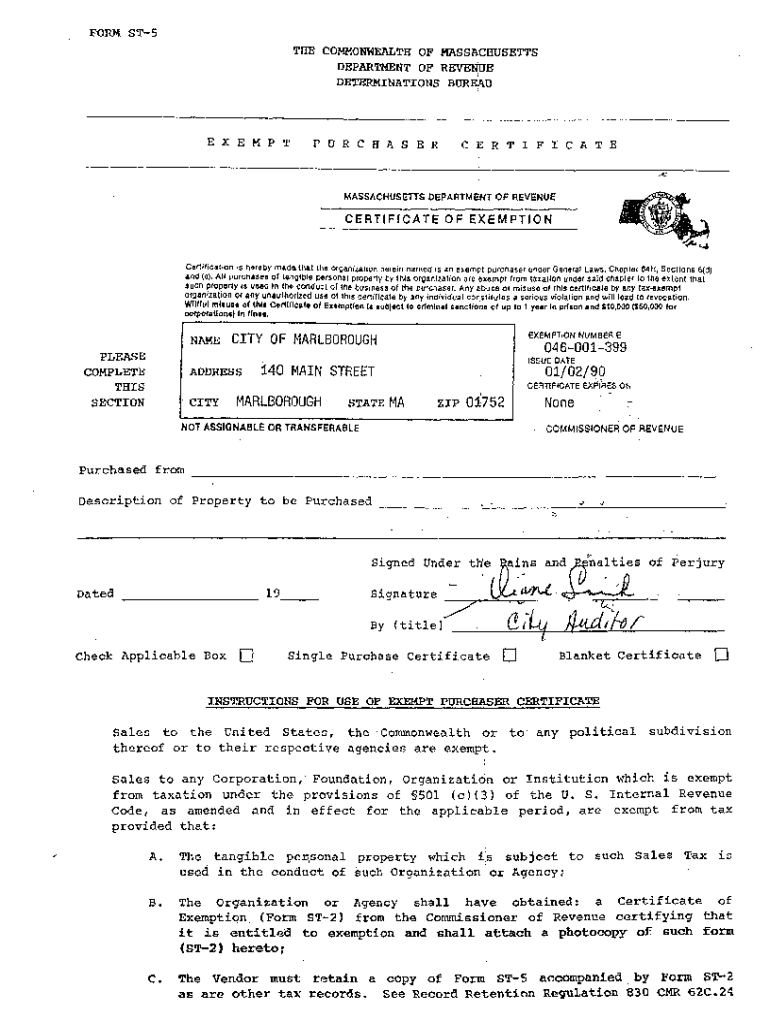 FORM ST5 THE COMMONWEALTH OF MASSACHUSETTS DEPARTMENT OF REVENUE DETERMINATIONS BUREAU X E M P T P U R C H A S E R C E R T I F I C A T E 1 MASSACHUSETTS DEPARTMENT OF REVENUECERTIFICATE OF EXEMPTIONCertification