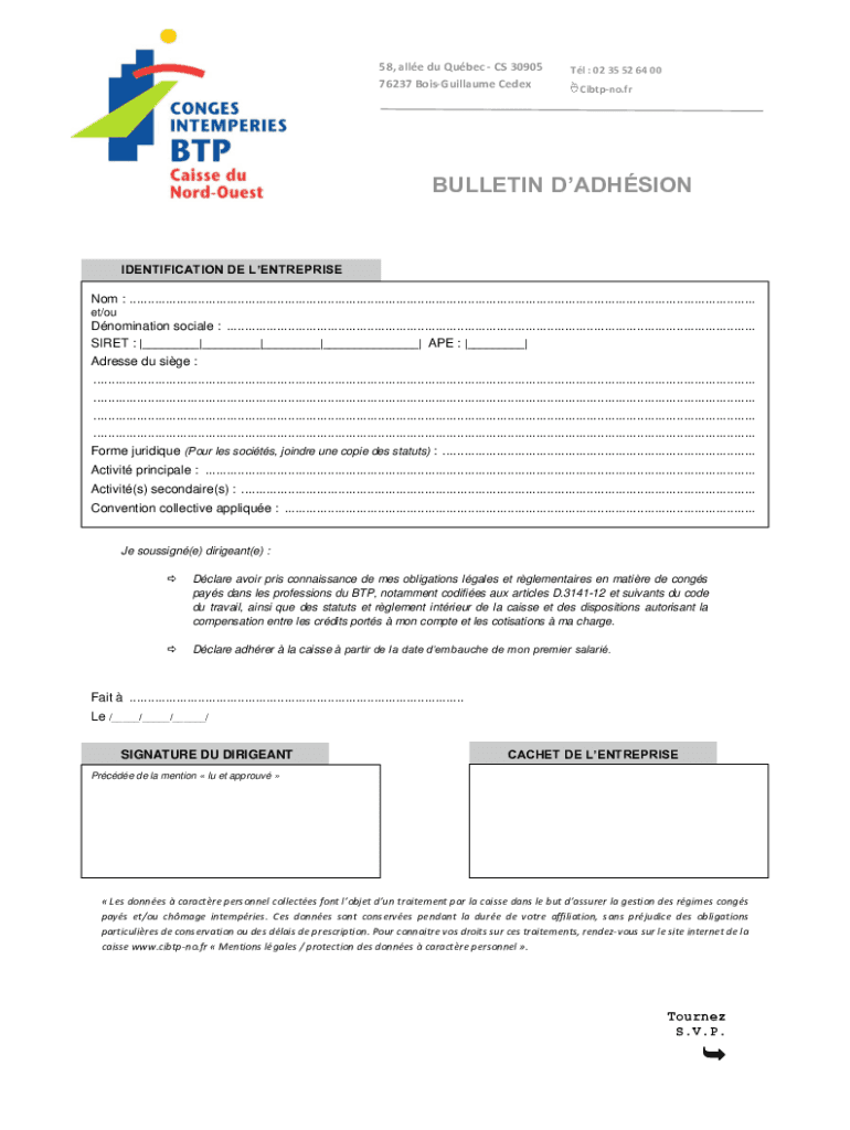Get the free BULLETIN DADHSION - cibtp-no.fr