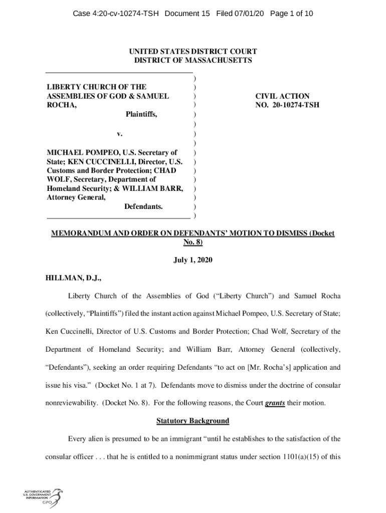 Case 4:20cv10274TSH Document 15 Filed 07/01/20-Page 1 of 10UNITED STATES DISTRICT COURT DISTRICT OF MASSACHUSETTS ___) LIBERTY CHURCH OF THE)) ASSEMBLIES OF GOD & SAMUEL CIVIL ACTION) ROCHA, NO. 2010274TSH