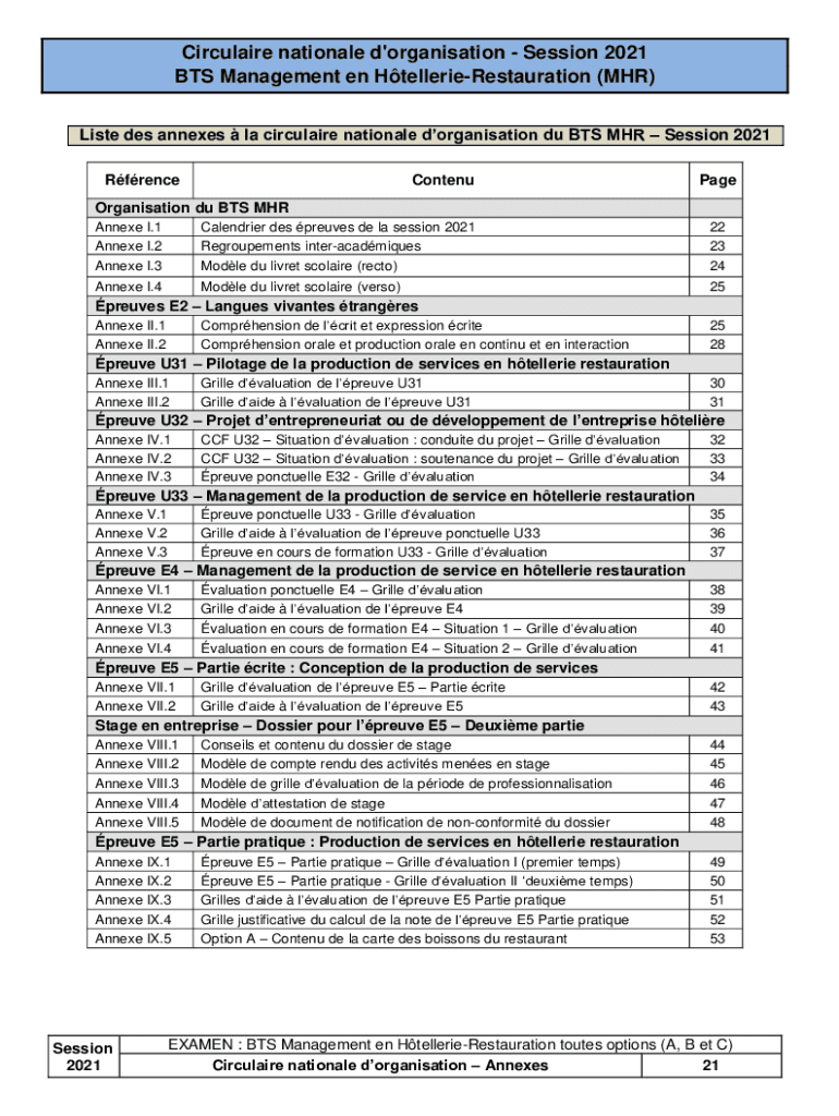 Circular national d\'organization Session 2021 BTS Management en HtellerieRestauration (MHR) List DES annexes la circular national organization Du BTS MHR Session 2021 RfrenceContenuPageOrganisation