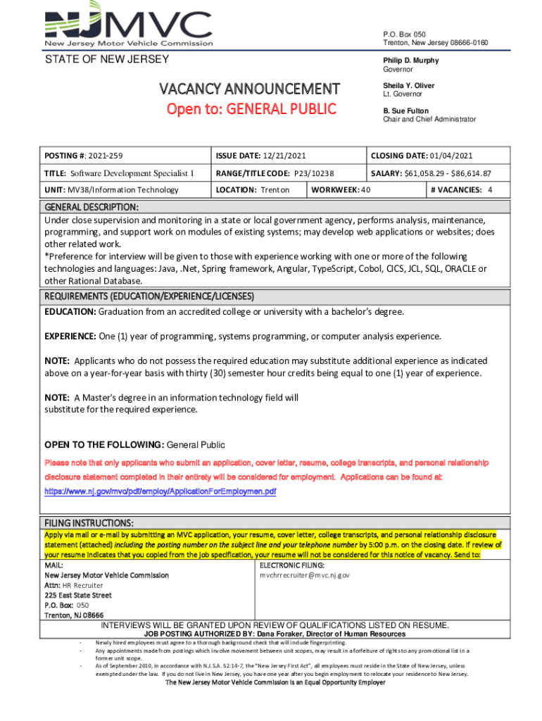 P.O. Box 050 Trenton, New Jersey 086660160STATE OF NEW JERSEY Philip D. Murphy GovernorVACANCY ANNOUNCEMENT Open to: PUBLIC Sheila Y. Oliver Lt. Governor B. Sue Fulton Chair and Chief AdministratorPOSTING
