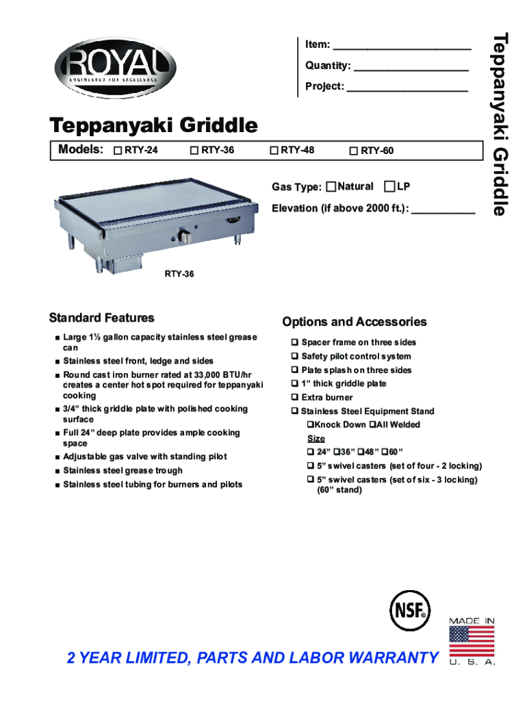 Quantity: ___ Project: ___Teppanyaki Griddle Models:RTY36RTY24RTY48RTY60Gas Type:NaturalLPElevation (if above 2000 ft.): ___RTY36Standard Features Large 1 gallon capacity stainless steel grease can