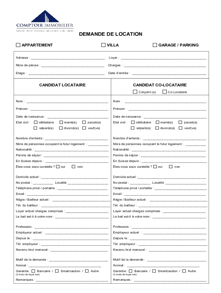DEMAND DE LOCATION APPARTEMENTVILLAGARAGE / PARKINGAdresse : ___Lower : ___BRE de pics : ___Charges : ___Stage : ___Date denture : ___CANDIDATE LOCATAIRECANDIDAT COLOCATE Conjoint (e)CoLocataireNom