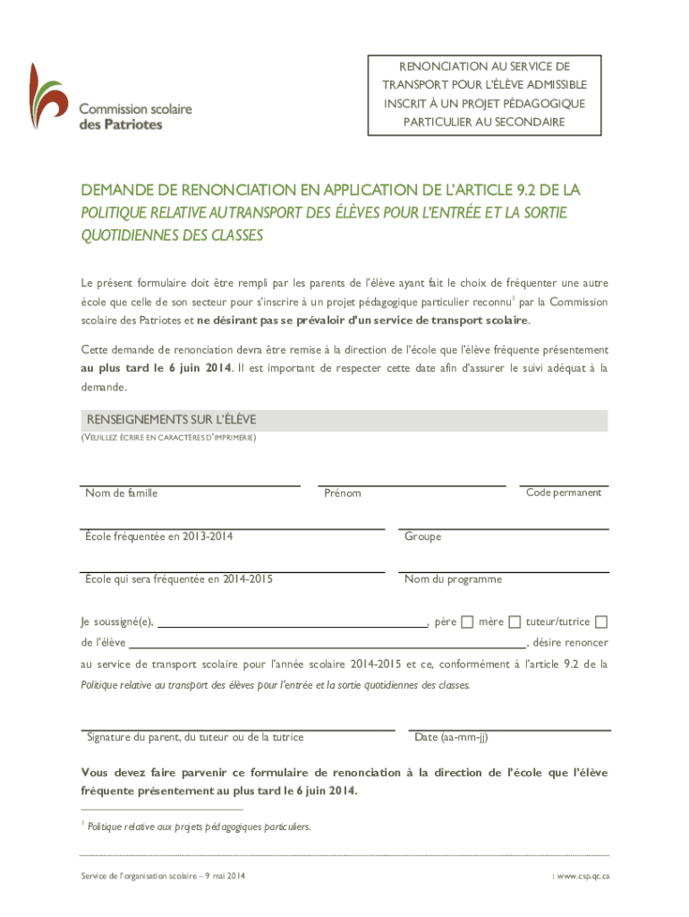 RENUNCIATION AU SERVICE DE TRANSPORT POUR LOVE ADMISSIBLE INHERIT UN PROJECT PEDAGOGUE PARTICULAR AU SECONDAIREDEMANDE DE RENUNCIATION EN APPLICATION DEL ARTICLE 9.2 DE LA POLITICAL RELATIVE AU TRANSPORT