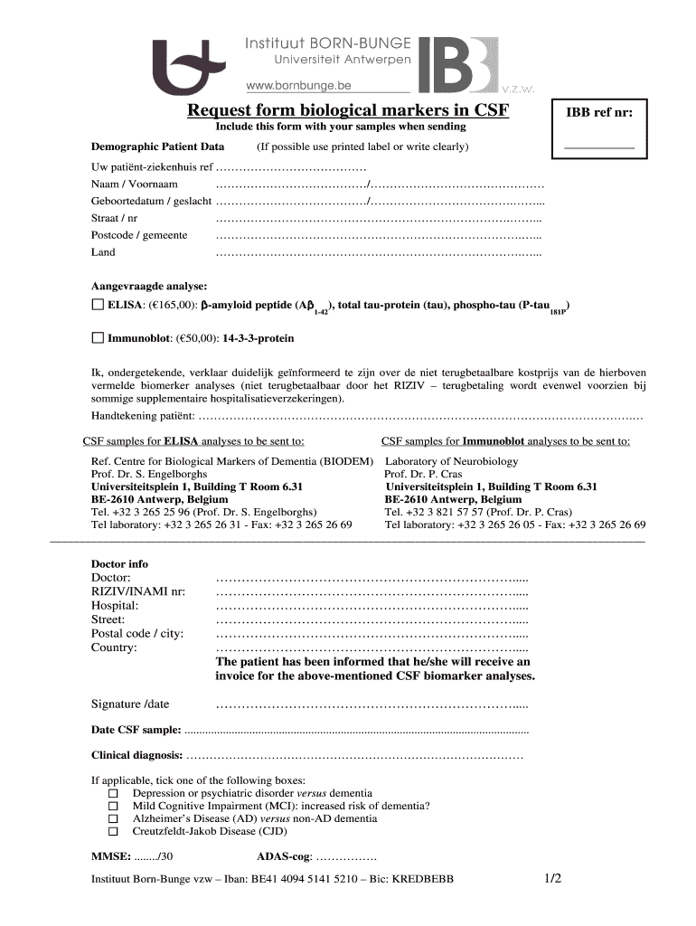 Request form biological markers in CSF IBB ref NR: Include this form with your samples when sending Demographic Patient Data (If possible use printed label or write clearly) UW path nt-ziekenhuis