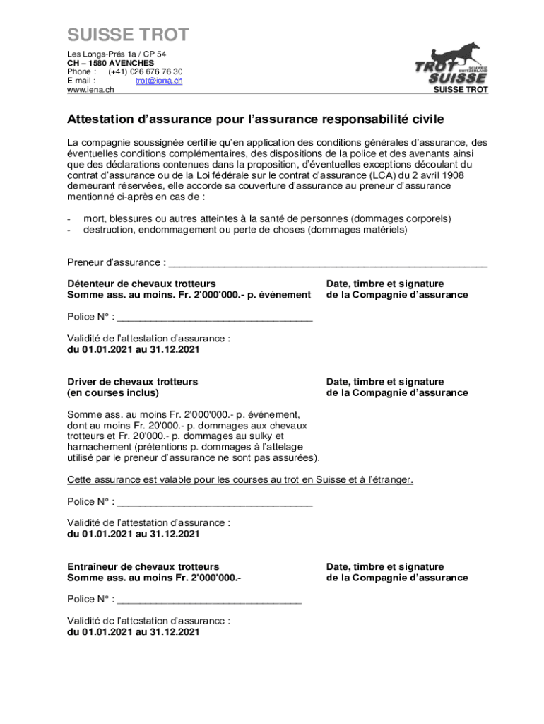 SWISS TROT Les Longer 1a / CP 54 CH 1580 AGENCIES Phone : (+41) 026 676 76 30 Email : trot@iena.ch www.iena.chSUISSE TROTAttestation assurance pour assurance responsibility civil La companies Poussin