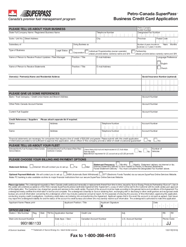 PetroCanada Surpass Business Credit Card ApplicationCanadas premier fuel management programState Full Company Name / Registered Business NameTelephone NumberPetroCanada Outlet Number Designated Fax