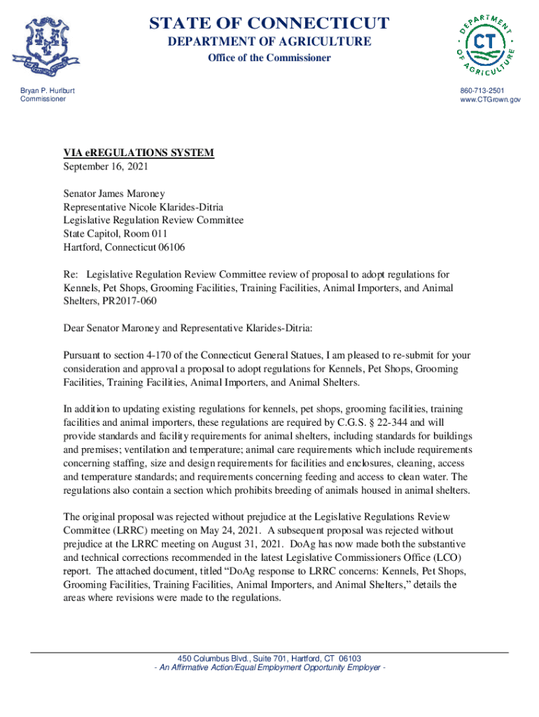 STATE OF CONNECTICUT DEPARTMENT OF AGRICULTURE Office of the Commissioner Bryan P. Herbert Commissioner8607132501 www.CTGrown.govVIA regulations SYSTEM September 16, 2022, Senator James Marina Representative
