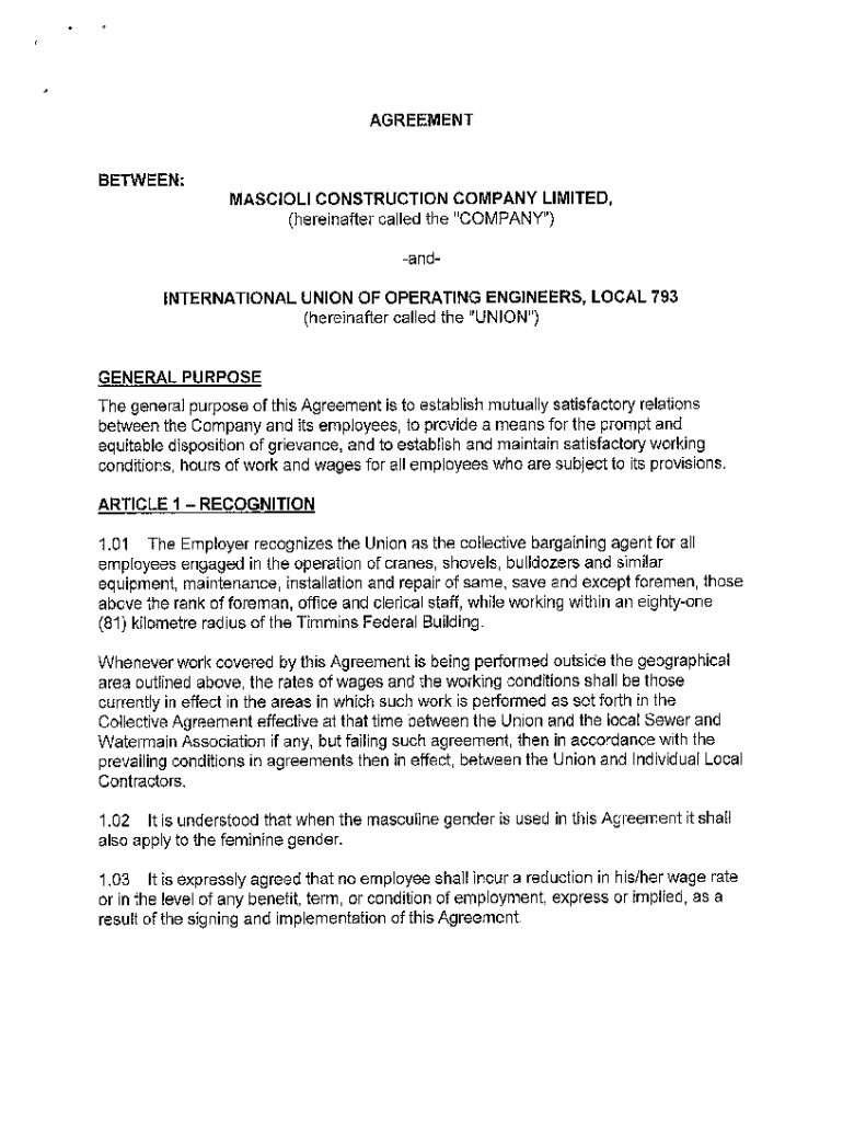 AGREEMENTBETWEEN: MASCOT CONSTRUCTION COMPANY LIMITED, (hereinafter called the \'COMPANY\') international UNION OF OPERATING ENGINEERS, LOCAL 793 (hereinafter called the \'UNION\')GENERAL PURPOSE