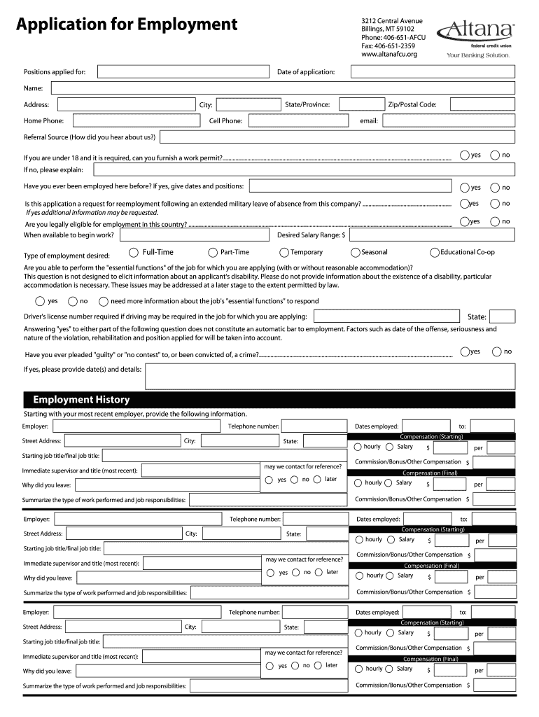 Application for Employment Positions applied for: 3212 Central Avenue Billings, MT 59102 Phone: 406-651-AFCU Fax: 406-651-2359 www.altanafcu.org Date of application: Name: Address: State/Province: