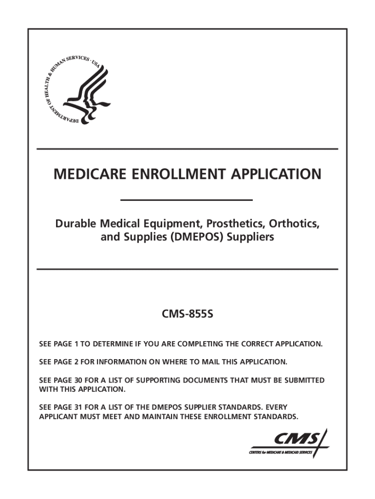 MEDICARE ENROLLMENT APPLICATION Durable Medical Equipment, Prosthetics, Orthotics, and Supplies (DM EPOS) SuppliersCMS855S SEE PAGE 1 TO DETERMINE IF YOU ARE COMPLETING THE CORRECT APPLICATION. SEE