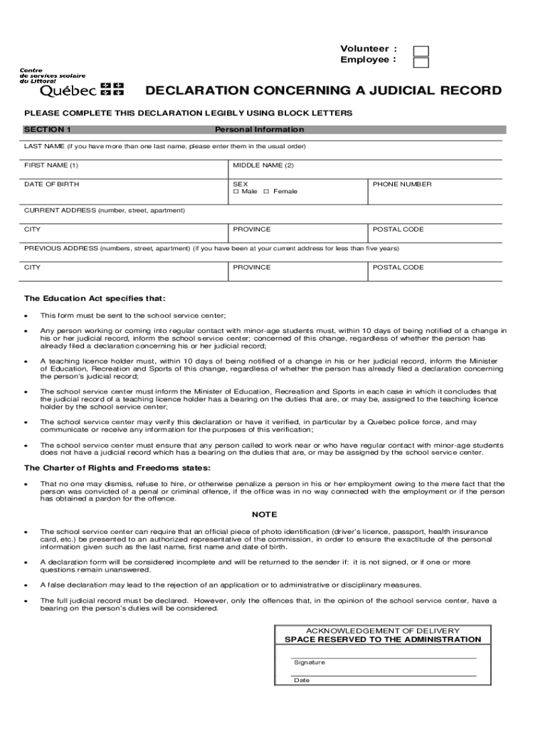 Volunteer : Employee :DECLARATION CONCERNING A JUDICIAL RECORD PLEASE COMPLETE THIS DECLARATION LEGIBLY USING BLOCK LETTERS SECTION 1Personal Informational NAME (if you have more than one last name,