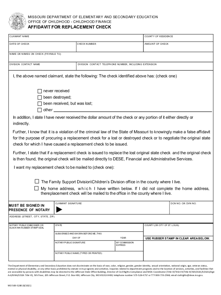 MISSOURI DEPARTMENT OF ELEMENTARY AND SECONDARY EDUCATION OFFICE OF CHILDHOOD FINANCEAFFIDAVIT FOR REPLACEMENT CHECK CLAIMANT Nye County OF RESIDENCEDATE OF CHECKCHECK NUMBERAMOUNT OF CHECKMATE OR