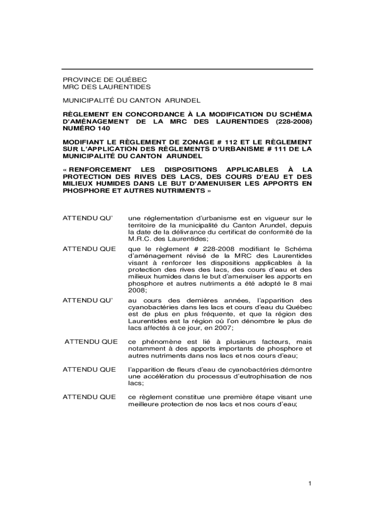 PROVINCE DE QUEBEC MRC DES LAUREATES MUNICIPALITY DU CANTON ROUNDEL ELEMENT EN CONCORDANCE LA MODIFICATION DU SCHEMA MANAGEMENT DE LA MRC DES LAUREATES (2282008) NU MRO 140 MODIFIED LE ELEMENT DE