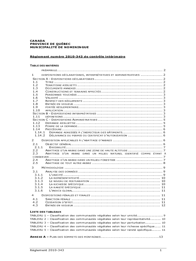 CANADA PROVINCE DE QUEBEC MUNICIPALITY DE NOMININGUERglement humor 2010343 DE control intrimaireTABLE DES MATURES PREAMBLE...1DISPOSITIONS DCLARATOIRES, INTERPRETATIVE ET ADMINISTRATIVES2...................