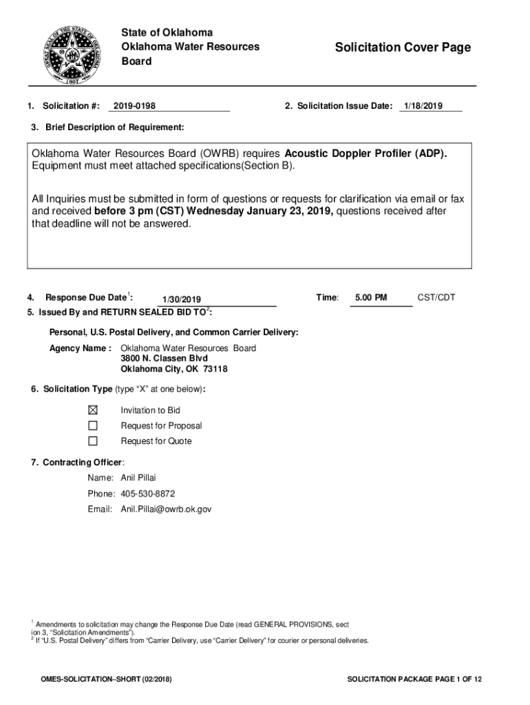 State of Oklahoma Water Resources Board1. Solicitation #:20190198Solicitation Cover Page2. Solicitation Issue Date:1/18/20193. Brief Description of Requirement:Oklahoma Water Resources Board (ORB)