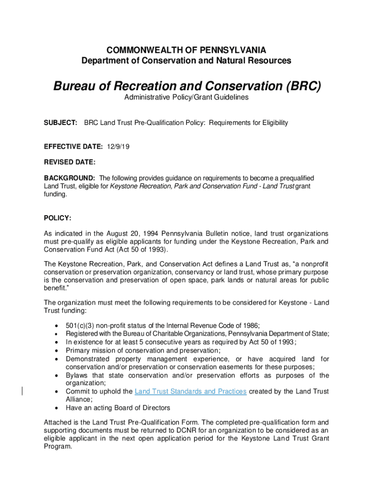 COMMONWEALTH OF PENNSYLVANIA Department of Conservation and Natural ResourcesBureau of Recreation and Conservation (BRC) Administrative Policy/Grant GuidelinesSUBJECT:BRC Land Trust PreQualification