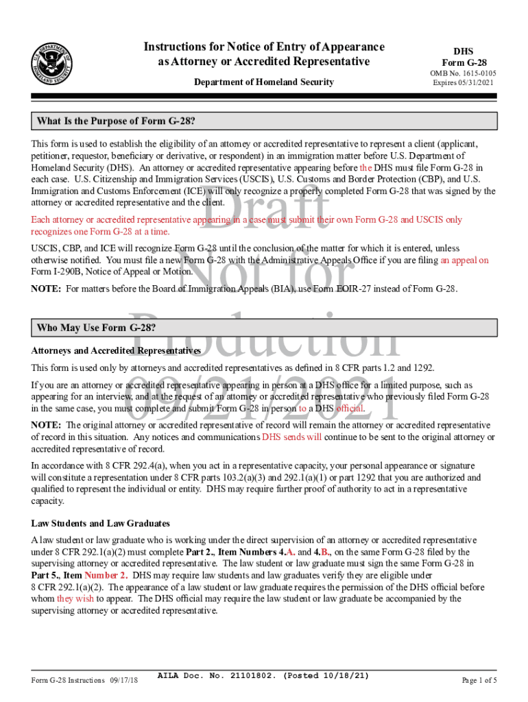 Instructions for Notice of Entry of Appearance as Attorney or Accredited Representative Department of Homeland Security DHS Form G28OMB No. 16150105 Expires 05/31/2021What Is the Purpose of Form G28?