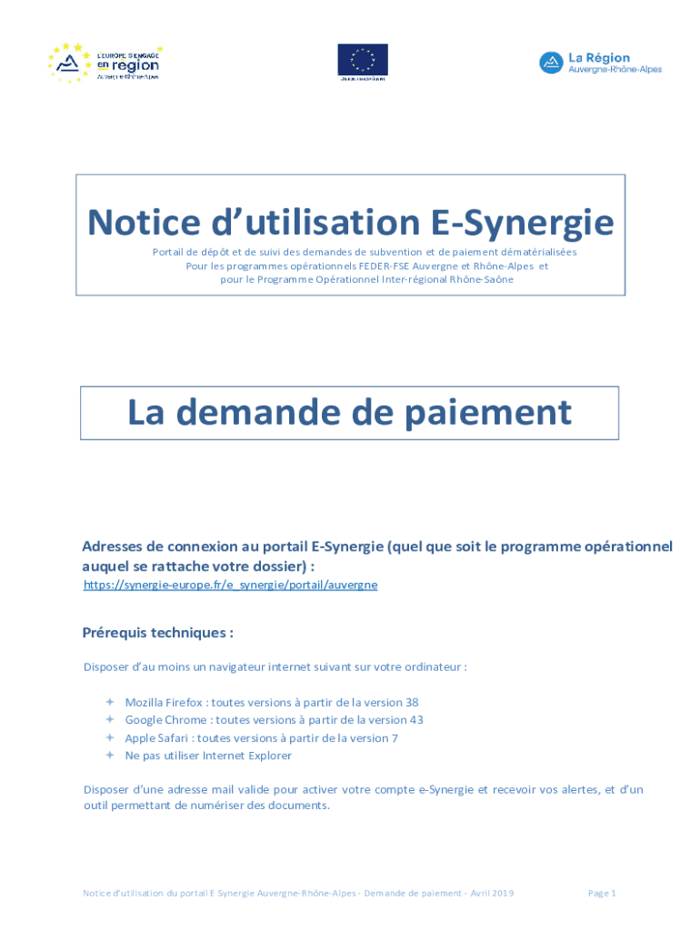 Notice utilization Synergies Portal DE dpt et de soon DES demands DE subvention et de pavement materializes Pour LES programs oprationnels FEDERATE Eggplant et Rhône-Alpes et pour LE Program Operational