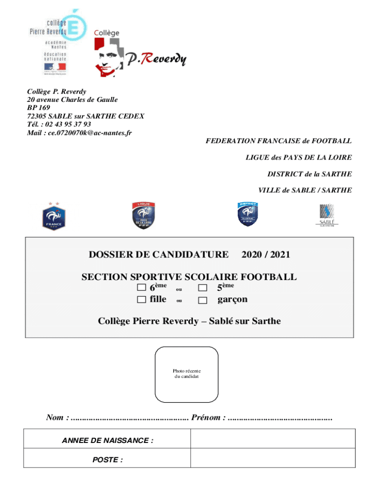 College P. Every 20 avenue Charles de Gaulle BP 169 72305 SABLE SUR SARTHE CEDEX Tl. 02 43 95 37 93 Mail : ce.0720070k@acnantes.fr FEDERATION FRANCHISE DE FOOTBALL LI GUE DES PAYS DE LA LOIRE DISTRICT