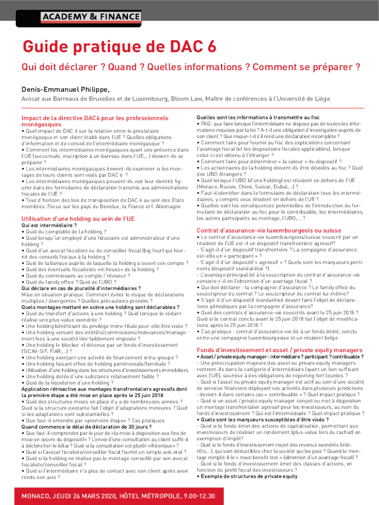 Guide to critique de DAC 6 Quit dots clear ? Quad ? Quelled information ? Comment SE pr parer ? Denis Emmanuel Philippe, Advocate aux Barre aux DE Belles et de Luxembourg, Bloom Law, Mate DE conferences