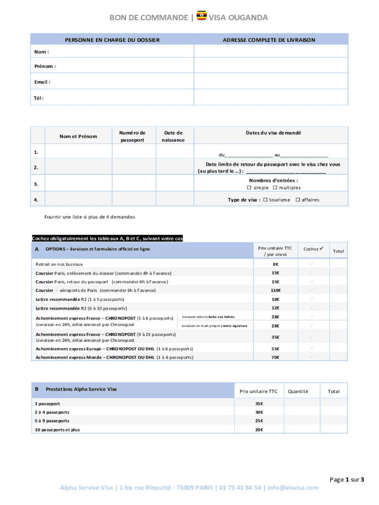 ON DE COMMAND | PERSONNEL EN CHARGE DU DOSSIERS UGANDA ADDRESS COMPLETE DE LIVRAISONNom : Prom : Email : Tl :Now met PrnomNumro de passeportDates Du visa mandate de naissance1. Du___ Au___ Date limited