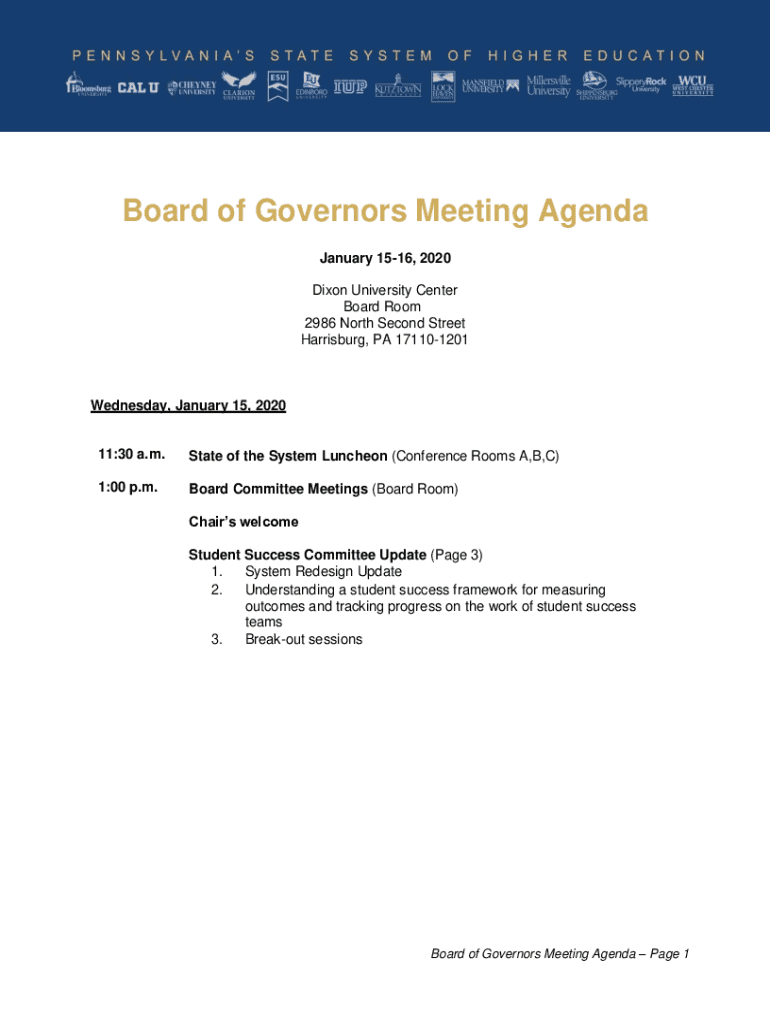 Board of Governors Meeting Agenda January 1516, 2020 Dixon University Center Board Room 2986 North Second Street Harrisburg, PA 171101201Wednesday, January 15, 2020 11:30 a.m. State of the System