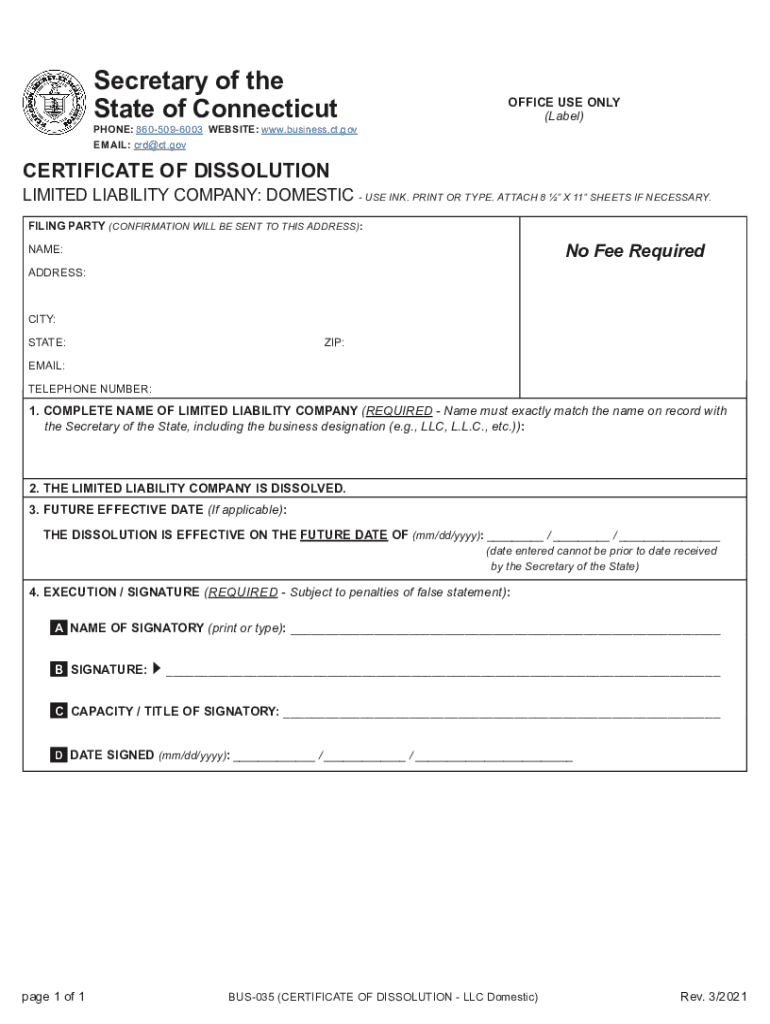 Secretary of the State of ConnecticutOFFICE USE ONLY (Label)PHONE: 8605096003 WEBSITE: www.business.ct.gov EMAIL: crd@ct.govCERTIFICATE OF DISSOLUTIONLIMITED LIABILITY COMPANY: DOMESTIC USE INK. PRINT