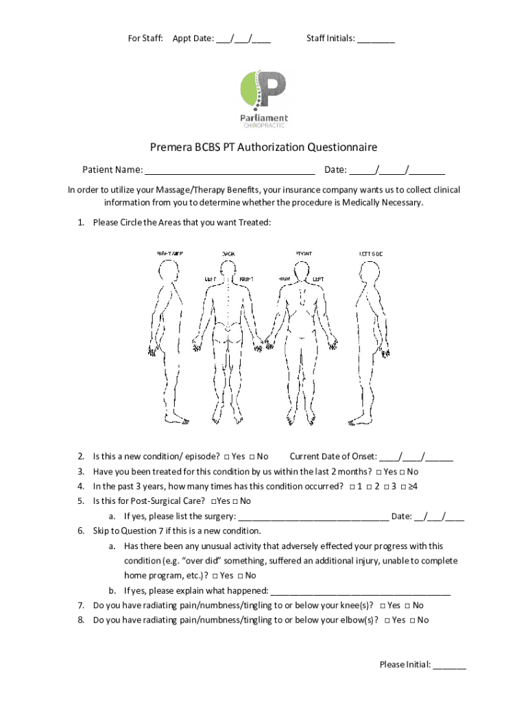 For Staff: Apt Date: ___/___/___Staff Initials: ___Premiere BCBS PT Authorization Questionnaire Patient Name: ___ Date: ___/___/___ In order to utilize your Massage/Therapy Benefits, your insurance
