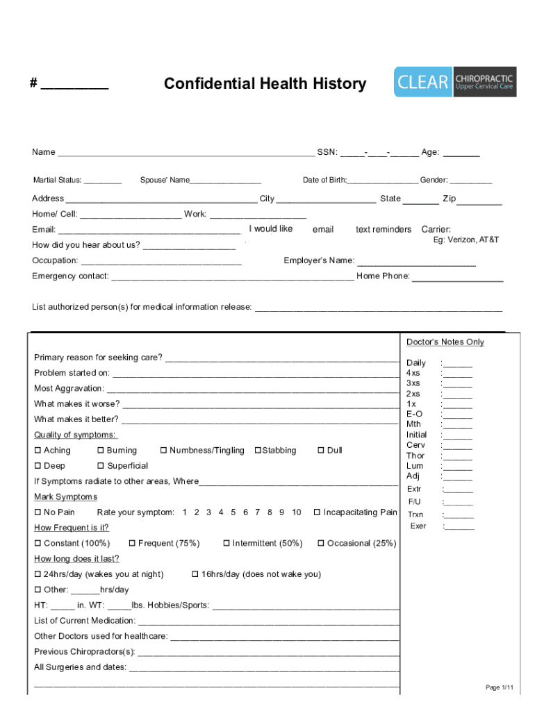 Confidential Health History# ___Name SSN: _________ Age: ______ Martial/ Status: Spouse\' Name___ Date of Birth:___ Gender: ___ Male Female___ Date of Birth: ___ Marital status: ___Address ___ _ City