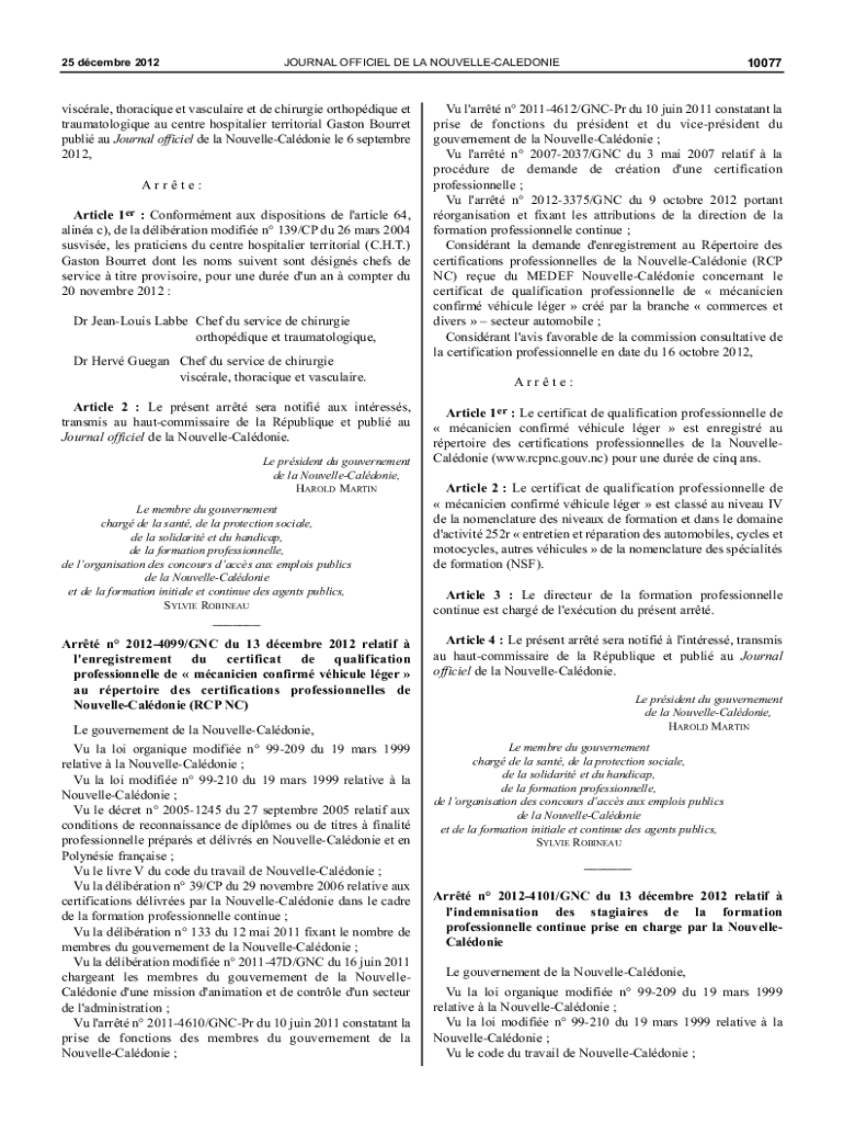 25 December 201210077JOURNAL OFFICIAL DE LA NOUVELLECALEDONIEviscrale, thoracic ET vascular et de chirurgie orthopdique et traumatologique AU center hospitality territorial Gaston Bourrèe public