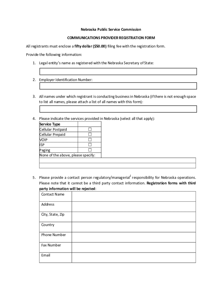 Nebraska Public Service Commission COMMUNICATIONS PROVIDER REGISTRATION FORM All registrants must enclose a fifty dollar ($50.00) filing fee with the registration form. Provide the following information: