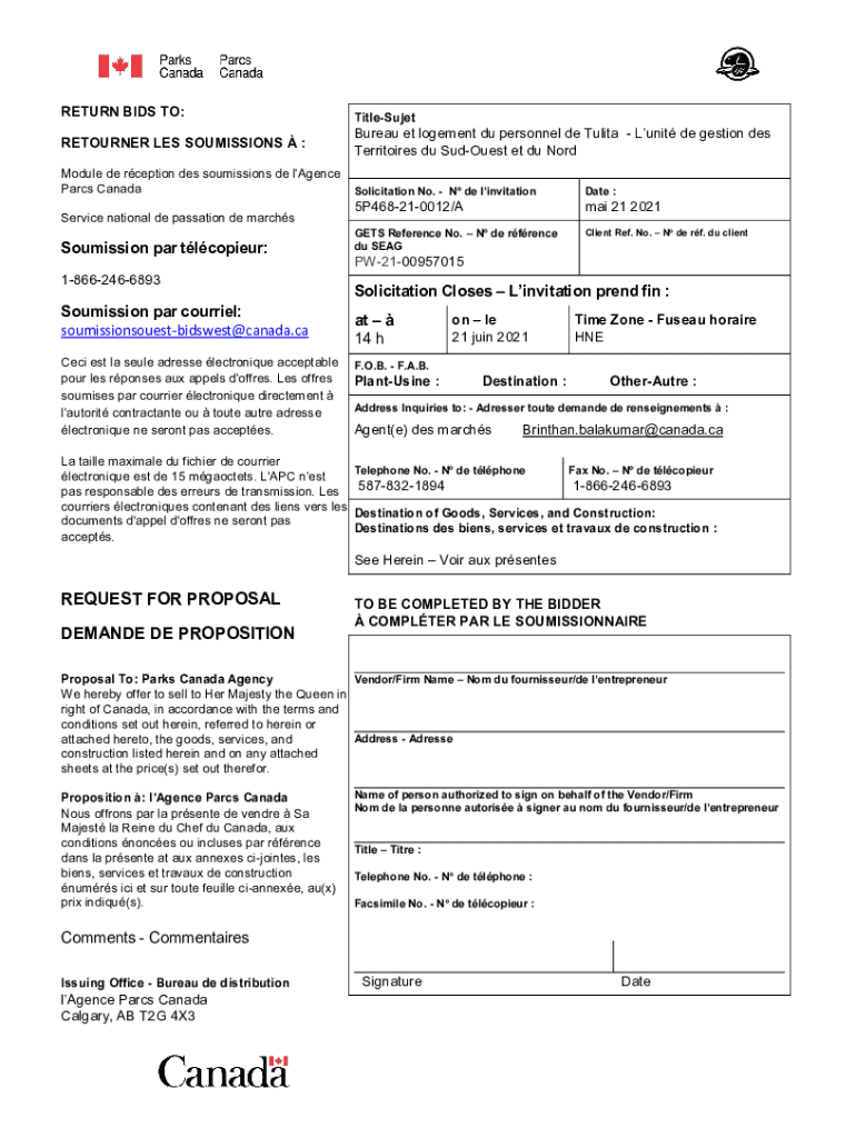 RETURN BIDS TO:TitleSujetRETOURNER LES COMMISSIONS :Bureau ET movement Du personnel de Julia Unit de section DES Territories Du Sudsiest et Du NordModule de reception DES sou missions DE agency PARCs
