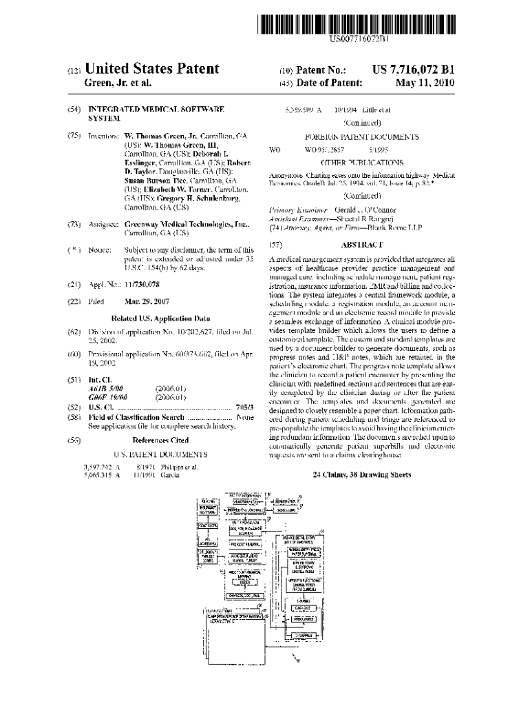 USOO7716072B1(12) United States Patent Green, Jr. et al.(10) Patent No.: US 7,716,072 B1 (45) Date of Patent: May 11, 2010(54) INTEGRATED MEDICAL SOFTWARE SYSTEM5,359,509 A(75) Inventors: W. Thomas
