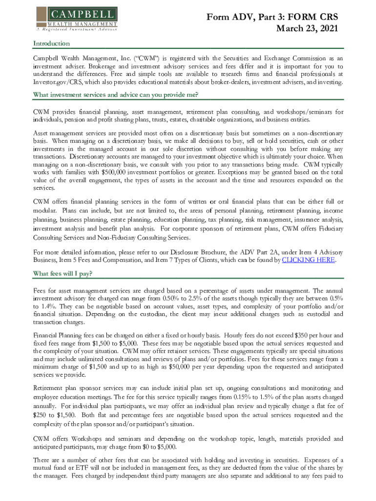 F Form AD DV, Part 33: FORM M CRS M March 23, 2021, Introduction C Campbell Wealth Managed meet, Inc. (C CWM) is registered with the Securities and Exchange NGE Commission as an in investment ad adviser.