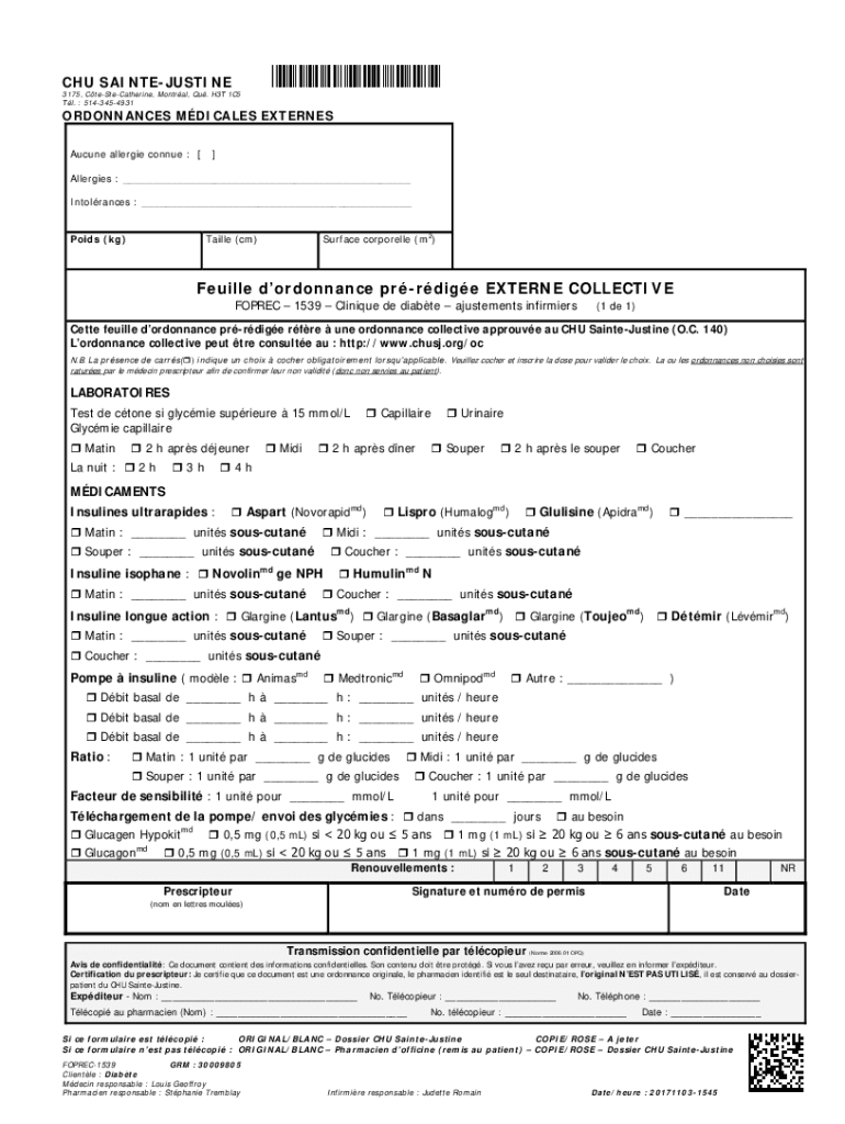 *hsj0300×CHU SAINTEJUSTINE3175, CteSteCatherine, Montreal, EU. H3T 1C5 Tl. 5143454931ORDONNANCES MEDICALS EXTERNAL Acute allergic Connie : []Allergies : ___ Intolerances : ___ Ponds (kg)Surface
