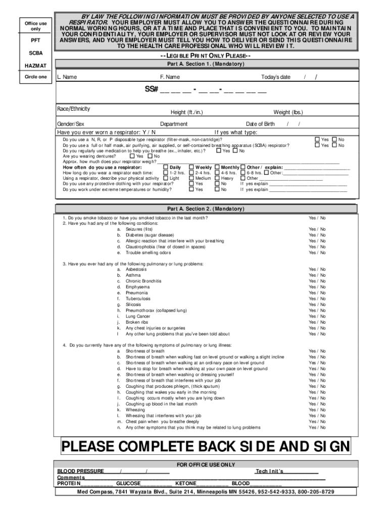 Office use onlyPFTBY LAW THE FOLLOWING INFORMATION MUST BE PROVIDED BY ANYONE SELECTED TO USE A RESPIRATOR. YOUR EMPLOYER MUST ALLOW YOU TO ANSWER THE QUESTIONNAIRE DURINGNORMAL WORKING HOURS, OR