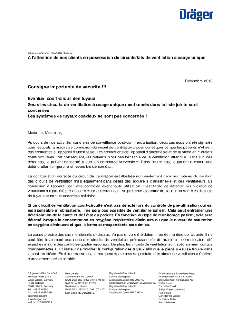 Drägerwerk AG & Co. GAA, 23542 Becky l\'attention DE nos clients en possession DE circuits/kits DE ventilation usage uniqueDcembre 2018Consigne important DE security !!! Eventual court circuit DES
