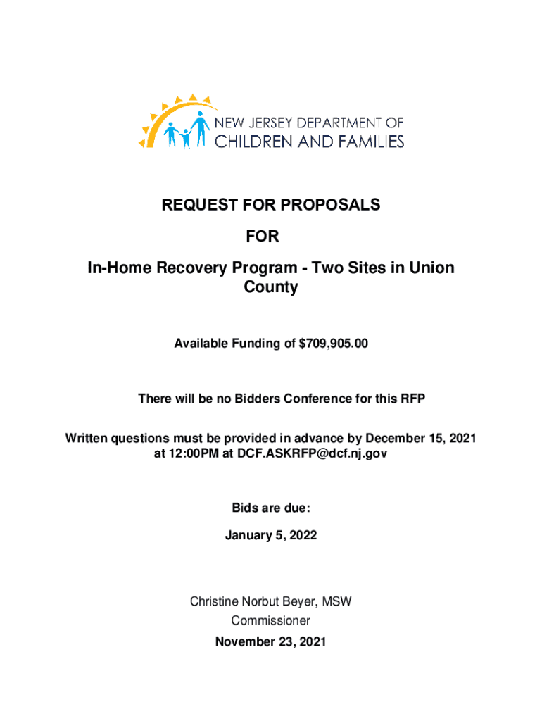 REQUEST FOR PROPOSALS FOR Income Recovery Program Two Sites in Union CountyAvailable Funding of $709,905.00There will be no Bidders Conference for this RFP Written questions must be provided in advance