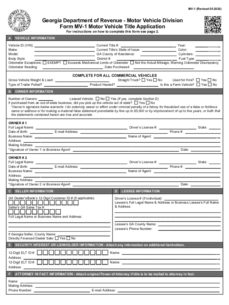 PRINTCLEARMV1 (Revised 052020)Georgia Department of Revenue Motor Vehicle Division Form MV1 Motor Vehicle Title Application For instructions on how to complete this form see page 2.VEHICLE INFORMATIONVehicle