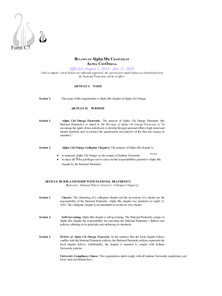 Form C7 BYLAWS OF Alpha Mu CHAPTER OF ALPHA CHI OMEGA Effective August 1, 2019, July 31, 2020Until a chapter local bylaws are officially approved, the current year model bylaws as distributed from