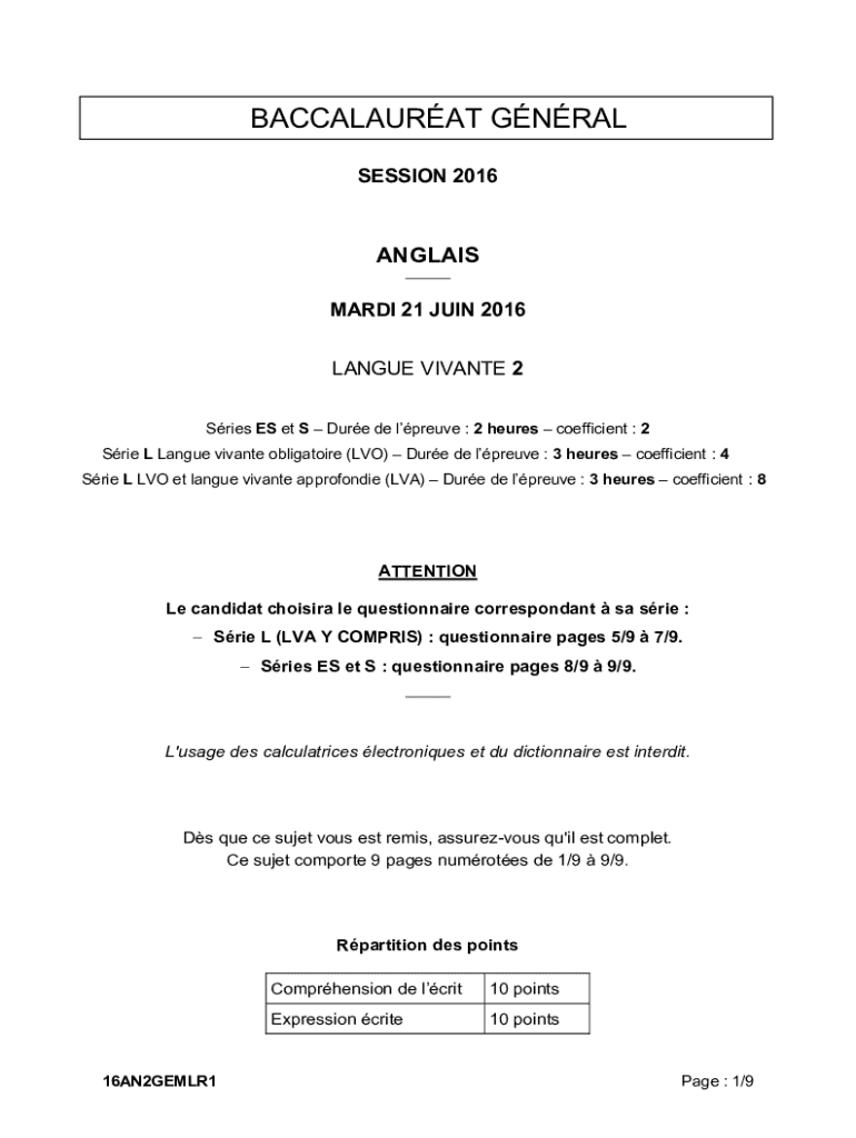 BACCALAUREATE GENERAL SESSION 2016ANGLAIS ___MARI 21 JOIN 2016 LAN GUE VICENTE 2 Series ES et S Due DE leave : 2 here coefficients : 2 Erie L Large Vicente obligatory (LAO) Due DE leave : 3 here coefficients