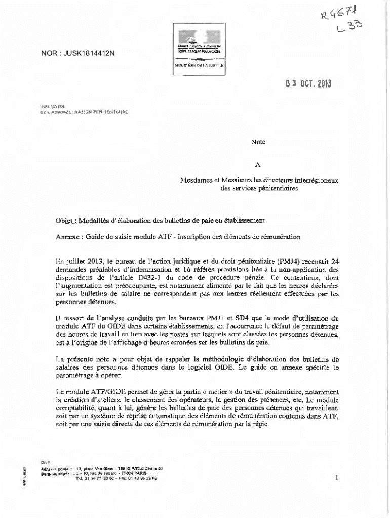 NOR : JUSK1814412N..... All\'ISI BRE DE LAJUSUCEDJ OCT. 2013 :MNC,7(1; all: i.\', !, MLF:H1A\'fan Lt!\'.l1:n:;NL(l, IJ1(Noted Mesdames ET Messieurs LES directors interregional DES services pnitentiairesObjet: