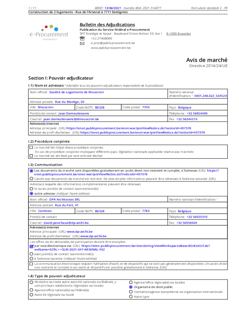 1 / 11 BE00113/04/2021 Humor BDA: 2021514077 Construction DE 2 movements Rue de l\'Arsenal 7711 DottigniesFormulaire standard 2 Bulletin DES Adjudications Publication du Service Feral procurement