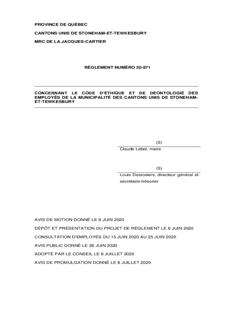 PROVINCE DE QUEBEC CANTONS UNIS DE STONEHAMETTEWKESBURY MRC DE LA JACQUESCARTIERRGLEMENT NU MRO 20871___ CONCERN ANT LE CODE UNIQUE ET DE DEONTOLOGIES DES EMPLOYS DE LA MUNICIPALITY DES CANTONS UNIS