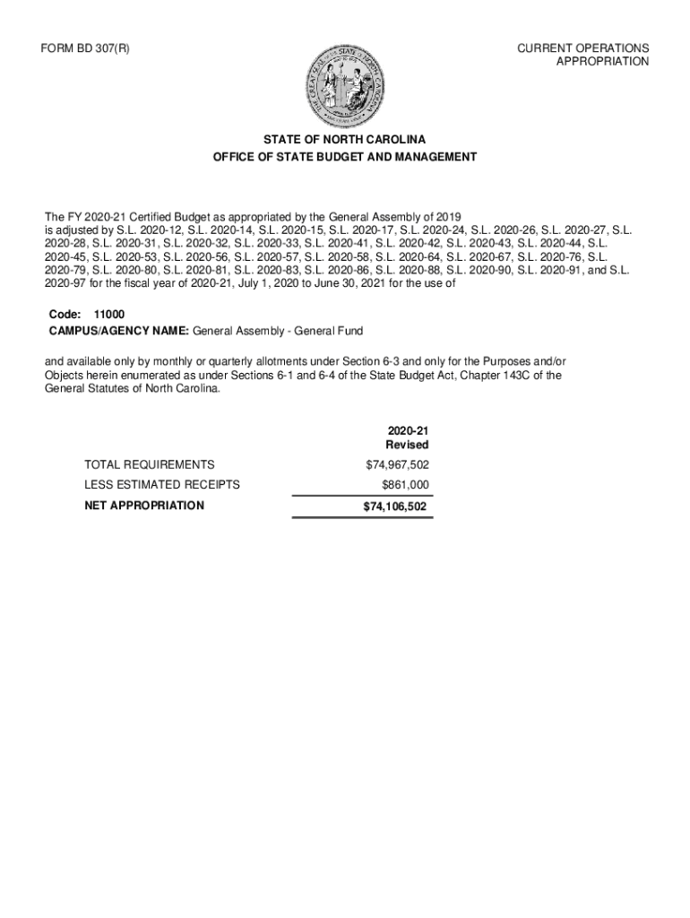 FORM BD 307(R)CURRENT OPERATIONS APPROPRIATIONSTATE OF NORTH CAROLINA OFFICE OF STATE BUDGET AND Management FY 202021 Certified Budget as appropriated by the General Assembly of 2019 is adjusted by